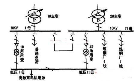 該站充電機(jī)電源正常由1#所用主變供電,10kV母聯(lián)和低壓母聯(lián)均在斷開位置,由于10kV I段母線未帶鋼廠負(fù)荷,高頻充電機(jī)運(yùn)行正常。在1#主變更換期間,全站10kV負(fù)荷和低壓負(fù)荷全部由2#主變所帶,而10kV II母線帶有兩回鋼廠負(fù)荷,且該鋼廠未裝消諧裝置,當(dāng)?shù)怪链朔绞竭\(yùn)行不到10min,該變電站高頻電源模塊就有兩個(gè)燒壞,同時(shí)也有10kV其他用戶反映其高頻電源燒壞。
