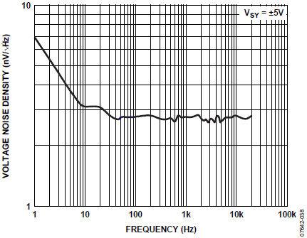 對于20kHz的帶寬,該乘數(shù)因子為141。舉ADA4075-2為例,其噪聲密度為2.8 nV/√Hz乘以141,因此噪聲電平為0.395μV或-128 dBV。運(yùn)算放大器的噪聲密度通常在數(shù)據(jù)手冊的典型特性部分的表格中顯示,且通常顯示其整個頻率范圍內(nèi)的曲線。該圖表可用于查看在何頻率下運(yùn)算放大器噪聲將取決于1/f噪聲。對于許多運(yùn)算放大器來說,這個點(diǎn)通常低于音頻頻帶(20Hz)低端,但是噪聲密度的曲線仍然值得一看,且不能僅參考噪聲密度指數(shù)來完全描述噪聲性能。圖1為ADA4075-2數(shù)據(jù)手冊中的噪聲密度圖實(shí)例。請注意圖1中1/f轉(zhuǎn)折點(diǎn)約為10Hz,遠(yuǎn)低于MEMS麥克風(fēng)前置放大器電路的目標(biāo)頻帶。