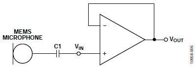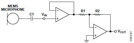 單個運(yùn)算放大器可以簡單地作為MEMS麥克風(fēng)輸出的前置放大器應(yīng)用于電路中。MEMS麥克風(fēng)是一個單端輸出設(shè)備,因此單個運(yùn)算放大器級可用于為麥克風(fēng)信號增加增益或僅用于緩沖輸出。