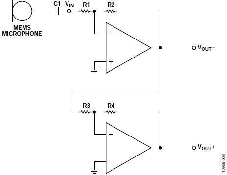 MEMS麥克風(fēng)的單端輸出可用兩個運(yùn)算放大器和兩個反相電路級(見圖8)以簡單的串聯(lián)結(jié)合轉(zhuǎn)換為一個差分信號。每級的輸出轉(zhuǎn)換為彼此反相,作為差分對。圖8顯示的電路中信號的放大發(fā)生在第一級,由R1和R2設(shè)置。電阻R3和R4值應(yīng)相等,為第二級提供單位增益。為了實(shí)現(xiàn)最佳性能,應(yīng)該采用1%電阻(或更好)來使兩級之間的誤差最小化。