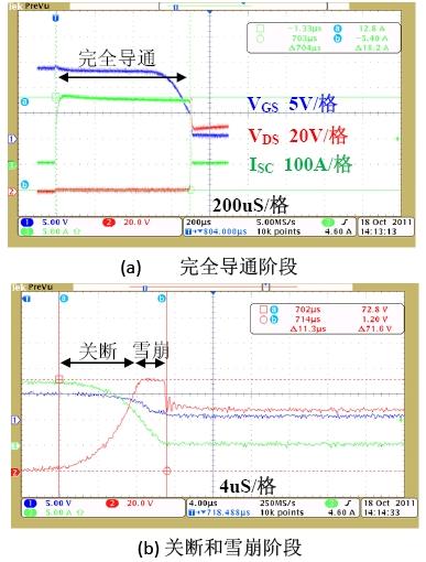 圖2:短路過程。(a) 完全導通階段;(b) 關斷和雪崩階段。