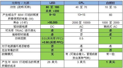 LED 照明高增長率背后的主要驅(qū)動(dòng)力是,與傳統(tǒng)照明方法相比,LED 照明的功耗大幅降低。與白熾燈照明相比,要提供同樣的光輸出 (以流明為單位),LED需要的電功率不到白熾燈的 20%。由表 1 可見,LED 照明還有其他很多優(yōu)勢(shì),但是也有一些與 LED 照明有關(guān)的挑戰(zhàn)。LED 照明的優(yōu)勢(shì)包括工作壽命比白熾燈長數(shù)個(gè)量級(jí),這極大地降低了更換成本。能利用以前安裝的 TRIAC 調(diào)光器給 LED 調(diào)光,也是一個(gè)主要的成本優(yōu)勢(shì),尤其是在住宅照明翻新應(yīng)用中。LED 能即時(shí)接通,不像 CFL那樣需要預(yù)熱時(shí)間,而且 LED 對(duì)電源循環(huán)不敏感,這一點(diǎn)也與 CFL 不同。此外,LED 不含任何需要管理或處置的有毒材料,而 CFL 需要有毒的水銀蒸氣才能工作。最后,LED 能實(shí)現(xiàn)新的和非常扁平的外形尺寸,這是其他技術(shù)不可能做得到的。