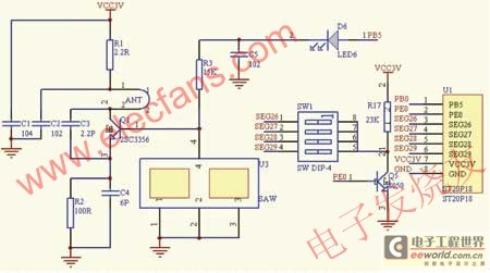 其中單片機(jī)采用的是 ST20P18,它是由臺灣矽創(chuàng)公司生產(chǎn)的一種CMOS工藝制造的低功耗低價(jià)位的8位單片機(jī),芯片內(nèi)部帶有振蕩器、系統(tǒng)定時器、看門狗定時計(jì)數(shù)器、LCD 控制器和16Kb的ROM以及192B的RAM。ST20P18控制的發(fā)碼電路原理圖如圖1所示,其發(fā)碼的基本原理為:系統(tǒng)利用撥碼開關(guān)來控制地址位和數(shù)據(jù)位(二進(jìn)制)信息的設(shè)置,再通過單片機(jī)運(yùn)行發(fā)碼程序進(jìn)行編碼并把地址位和數(shù)據(jù)位信息變換成一串脈沖信號,最后由無線發(fā)射電路發(fā)射出去。具體實(shí)現(xiàn)為:單片機(jī)PB0口為發(fā)碼電路的數(shù)據(jù)輸出口和控制口,當(dāng)需要發(fā)碼的時候該口設(shè)置為輸出口,然后以脈沖的形式,按照相關(guān)的通信協(xié)議,輸出當(dāng)前所要發(fā)出的正確數(shù)據(jù)。反之,PB0口可復(fù)用為其他功能。PB0口的脈沖數(shù)據(jù)經(jīng)發(fā)碼電路調(diào)制并發(fā)射出433MHz的無線電波。