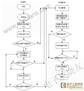 開機(jī)后,先進(jìn)行初始化,包括對單片機(jī)的初始化、LCD的初始化和其他模塊的初始化。出于省電的考慮在40s內(nèi)若沒有鍵按下,讓單片機(jī)的LCD控制器進(jìn)入空閑模式。用“for”循環(huán)來計(jì)時,并設(shè)計(jì)初值為零。隨后開始40s計(jì)時,若在此期間有鍵按下,則進(jìn)入中斷服務(wù)程序,若40s內(nèi)無鍵按下,則單片機(jī)的 LCD控制器進(jìn)入空閑模式。若在空閑中有鍵被按下,單片機(jī)被喚醒,執(zhí)行中斷服務(wù)程序。由于單片機(jī)的LCD控制器被中斷喚醒執(zhí)行完中斷程序返回后,單片機(jī)會接著執(zhí)行把單片機(jī)的LCD控制器置為空閑模式的那條指令的下一條指令,因此在把單片機(jī)的LCD控制器置為空閑模式的指令后再有一個循環(huán)來計(jì)時,由于中斷返回前,重設(shè)計(jì)數(shù)初值為零,所以會重新開始5s的計(jì)時。在這40s內(nèi),若無鍵按下, 則單片機(jī)的LCD控制器又進(jìn)入空閑模式。程序流程圖如圖4所示。