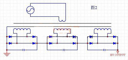 這種方式的電路示意圖如圖1所示。特點是,每個變壓器的升壓比不是很高,磁芯與次級繞組間的壓差不大。這種方法的優(yōu)點是:適合大功率輸出。變壓器繞組對磁芯的絕緣容易處理。缺點是:每個變壓器要傳遞的功率不一樣,最低壓端的變壓器傳遞功率最大,最高壓端的變壓器傳遞功率最高。每個變壓器對地絕緣要求不同。最高壓端的變壓器對地絕緣要求最高。由于變壓器存在漏感,所以越是遠離驅(qū)動輸入的變壓器,其回路中等效的漏感就越大。那么變壓器實際輸出的電壓是有差異的,即便匝比都是一致的。