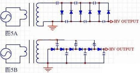 半波多倍壓電路有兩種結(jié)構(gòu),一種是圖5A的結(jié)構(gòu),這是基本的也是最常見的倍壓整流電路了。這種電路的優(yōu)點是:結(jié)構(gòu)簡單,二極管和電容的電壓應(yīng)力都不高,變壓器的輸出電壓也不算高。缺點是:帶負載能力較差,倍壓階數(shù)越高則電壓跌落越多,最終存在一個極限倍壓階數(shù)。超過這個階數(shù),電壓不再升高,反而會下降。另一種是圖5B的結(jié)構(gòu),這種電路的帶載能力強一些,但是電容的電壓應(yīng)力很高。