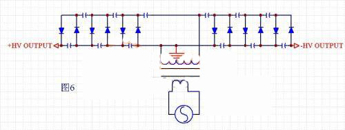 電路結(jié)構(gòu)見圖6,這其實是半波多倍壓電路的拓展結(jié)構(gòu)。可以同時的到正負高壓。當然,如果把其中端高壓接地,把變壓器次級懸浮,也是可以的。這樣做的好處是,得到同樣的高壓,只需要有半波多倍壓一半的階數(shù)就可以得到了。那么電壓跌落和紋波都小很多。缺點是:假如采用某端高壓接地,高壓變壓器次級懸浮的方式,對高壓變壓器的絕緣要求很高。假如高壓變壓器次級接地的話,那么得到的是正負高壓,使用上不是很方便。