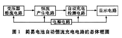 簡(jiǎn)易電池自動(dòng)恒流充電電路的總體框圖如圖1所示。它是由變壓器整流電路、恒流產(chǎn)生電路、自動(dòng)斷電電路、顯示電路和電源電路5部分構(gòu)成。