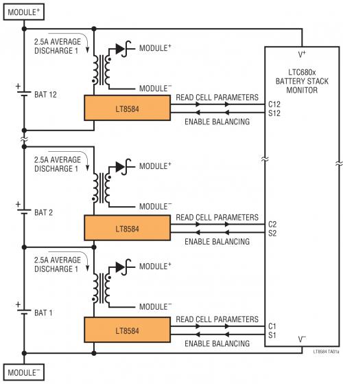 LT8584 (圖 8) 單片反激式 DC/DC 轉(zhuǎn)換器用單向拓撲實現(xiàn)了主動平衡。這種單向方式有一個優(yōu)勢,即從一個給定電池向整個電池組重新分配電荷,從而提供高效率電池放電。這種拓撲可能僅在放電方向移動電荷,因此對給定電池的“充電”會比雙向方式的效率低。集成的 6A 電源開關(guān)支持 2.5A 平均平衡電流。LT8584 還可以測量平衡電流、芯片溫度和電纜電阻。LT8584 直接連接到 LTC6804 AFE IC,實現(xiàn)了又一個易于使用兩個 IC 來監(jiān)視和平衡的方案。