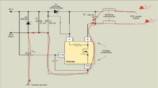 在PoE 應用中,PSE 是由 48-V 電源供電的。通常,PSE 會有一些與大地接地相連的共模電容。這些電容可以是離散電容,也可以是 PCB 板的層間電容,或兩類電容的結合。由于 PSE 實際上并不是浮動的,因此施加于數據連接器上的任何共模電壓瞬態(tài)都能造成 PSE 組件的電壓擊穿。對于 PSE 端口電源開關晶體管來說,尤其如此。圖 2 顯示了該效應,并顯示了在沒有保護電路時,造成對 PSE 電源開關晶體管損壞的大電流路徑。CCM 表示系統的 48-V 線路與外殼接地之間的共模電容。這可以是 48-V 電源的正或負(48-V回路)線路。為簡化原理圖,僅在負極線路顯示了 CCM。該配置適用于使用 AC 斷接電路時的應用,該配置還要求使用 D1。AC 斷接電路的工作會導致瞬態(tài)保護出現最壞的情況。