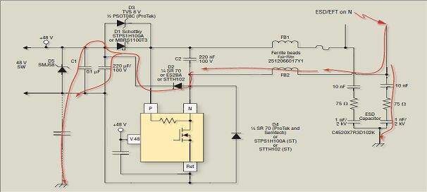 圖 5、本圖闡明了鐵氧體磁珠和鉗位二極管將正極ESD/EFT事件從 TPS2384 芯片的 N 終端轉移到底座接地的電流路徑。