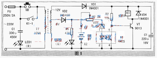 電路如圖1所示。GB為待充電電瓶,平時只要不再使用,就將充電器插頭X1、X2插入手提燈的充電插孔內(nèi)。按一下啟動按鈕SB,220V交流市電經(jīng)保險Fu、SB加在電源變壓器T1初級。其次級輸出兩路交流電壓:交流12V經(jīng)VD1半波整流、C2平滑濾波,使VT導(dǎo)通。繼電器K1吸合,K1-1閉合。此時松手使SB斷開后,充電器仍然工作。圖中,R2是VT的偏置電阻;C1是降壓電容,LED1(紅)為市電電源指示管;啟動完成后,交流9V電壓經(jīng)VD2整流為電瓶GB充電,LED2(綠)為充電指示管。隨著充電過程的進(jìn)行,電瓶兩端電壓不斷上升,當(dāng)升至極限電壓值(約7.5V)時,穩(wěn)壓管VD3反向擊穿導(dǎo)通,光耦合器4N25①、②腳內(nèi)發(fā)光二極管發(fā)光,④、⑤腳內(nèi)光電管受光后隨之導(dǎo)通,VT基極被下拉(約0V)而失去正偏壓,所以VT截止,K1釋放使K1-1斷開,充電器停止充電,充電指示管LED2熄滅。