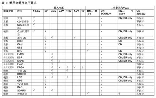 大多數(shù)系統(tǒng)電源的基本架構(gòu)選擇應(yīng)從電源要求以及汽車廠商定義的電池電壓瞬變波形入手。對于電流的要求應(yīng)該反映到電路板的散熱設(shè)計(jì)。表1歸納了大多數(shù)設(shè)計(jì)的電路及電壓要求。