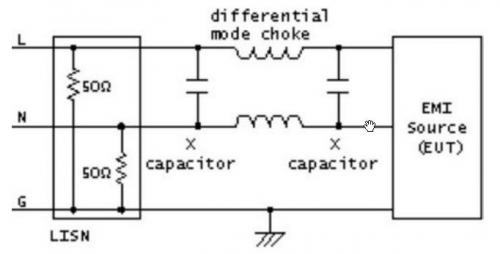 電容的作用是將高頻干擾電壓“短路”,另外,當(dāng)干擾信號(hào)頻率很高時(shí),抑制線圈將產(chǎn)生很大的交流阻抗。圖2顯示了兩種濾波類型的結(jié)構(gòu),其中,LISN是用于測(cè)量目的的線性阻抗穩(wěn)定網(wǎng)絡(luò)。如果是共模問(wèn)題引起的干擾,X類型電容基本上沒(méi)有作用,因?yàn)閮删上的干擾電壓是一樣的。因此,了解干擾類型對(duì)于選擇合理的電路結(jié)構(gòu)將起重要作用,并為解決問(wèn)題提供技術(shù)依據(jù)。