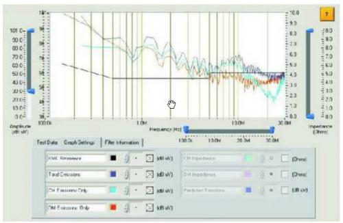 在標(biāo)準(zhǔn)電磁兼容性測(cè)試實(shí)驗(yàn)室可得到設(shè)備的總干擾情況,但無(wú)法了解設(shè)備的共模干擾和差模干擾特性。為了在測(cè)量中分辨共;蛘卟钅8蓴_信號(hào),通用的儀器是很難實(shí)現(xiàn)的。使用專用的傳導(dǎo)測(cè)試儀,可獲得設(shè)備的總干擾、共模干擾和差模干擾。測(cè)試結(jié)果如圖3所示。