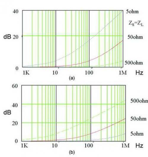 上面的例子說(shuō)明,選擇一個(gè)具有很高插損的濾波器也不能很好抑制傳導(dǎo)噪聲的原因是,電源輸入端阻抗的影響。因此,設(shè)計(jì)者除了選擇一個(gè)合適的濾波器之外,還需要了解電源的阻抗特性、共模阻抗和差模阻抗。阻抗測(cè)試可以借助專用的阻抗測(cè)試儀或者傳導(dǎo)分析儀。一種濾波器的共模阻抗(a)和差模阻抗(b)的變化如圖5所示。