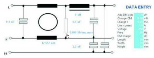 知道設(shè)備的干擾特性和輸入阻抗特性后,設(shè)計(jì)或者選擇一個(gè)濾波器就變得簡(jiǎn)單了。如果使用一個(gè)現(xiàn)成的濾波器,可以調(diào)用過(guò)去積累的濾波器數(shù)據(jù)庫(kù),比對(duì)濾波器參數(shù),找到一個(gè)合適的濾波器。如果沒(méi)有合適的或者想專門設(shè)計(jì)一個(gè)專用濾波器,可以借助專用的濾波器設(shè)計(jì)軟件。在確定一個(gè)濾波器模式后輸入濾波器一些簡(jiǎn)單的約束條件,設(shè)計(jì)軟件根據(jù)阻抗特性自動(dòng)計(jì)算出最合適的組件值,以及提供最合適的衰減。(如圖6所示)