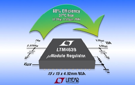 LTM4639 是完整的開關(guān)型負載點電源,包括電感器、MOSFET、DC/DC 控制器和補償電路。該器件采用高度為 4.92mm 的 BGA 封裝,占板面積為 15mm x 15mm。對于在 20A 負載時的 3.3V 輸入至 1.5V 輸出轉(zhuǎn)換而言,效率為 88%,功耗為 3.9W,結(jié)溫上升至比環(huán)境溫度高 37°C。該微型模塊穩(wěn)壓器提供了精準(zhǔn)的輸出電壓調(diào)節(jié):最大總 DC 誤差為 ±1.5%,保證工作在 -40°C 至 125°C 溫度范圍?刹⒙(lián)多達 4 個器件以提供高達 80A 的輸出,同時異相工作減少了輸入和輸出電容器數(shù)量。