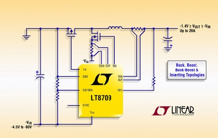 Linear推出適用于負(fù)至負(fù)或負(fù)至正 DC/DC 轉(zhuǎn)換的同步 PWM 控制器 LT8709。該器件無(wú)需復(fù)雜的電平轉(zhuǎn)換電路,就能夠獨(dú)特地解決相對(duì)于系統(tǒng)地的負(fù)電壓的調(diào)節(jié)問(wèn)題。LT8709 的同步工作意味著,一個(gè)高效率 P 溝道 MOSFET 取代了輸出二極管,因此提高了效率,允許更大的輸出電流 (高達(dá) 20A),而且無(wú)需中到大功率應(yīng)用通常所需的散熱器。LT8709 可配置為降壓、升壓、降壓-升壓和負(fù)輸出拓?fù)洌瑥亩乖撈骷叨韧ㄓ靡赃m用于多種電源設(shè)計(jì)。