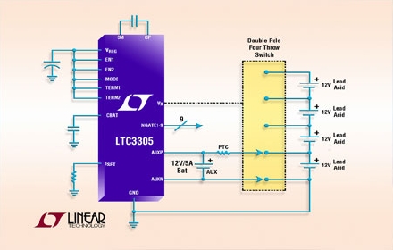 Linear推出單片、獨(dú)立多節(jié)電池平衡器 LTC3305,該器件適用于 12V 鉛酸電池。平衡是通過以下方式實(shí)現(xiàn)的:從電壓較高的電池吸取電荷,并將這些電荷傳送到電壓較低的電池,以使電池充電至相同電量。這些電荷是用一個(gè)容量較低的電池傳送的,該電池依次連接電池組上的電池。這個(gè)電池不僅傳送電荷,該電池中的能量也加到電池組的總能量中,從而增加了容量。該芯片還包括排序、面向外部高壓 NFET 的驅(qū)動(dòng)電路、電壓監(jiān)視和保護(hù)功能。LTC3305 為獨(dú)立工作而設(shè)計(jì),不需要微處理器或其他控制電路。有了 LTC3305,就可以更換電池組的電池,而且新更換的電池還能與電池組的其他原有電池快速平衡。LTC3305 非常適合電信備份系統(tǒng)、家用電池供電備份系統(tǒng)、電動(dòng)汽車和工業(yè)照明系統(tǒng)等應(yīng)用。