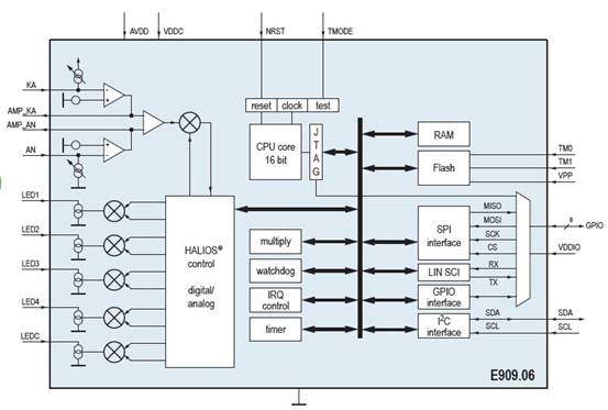 具體到方案的實(shí)現(xiàn)上主要通過兩款芯片E909.06及E909.07。E909.06是基于光電技術(shù)、內(nèi)置16位單片機(jī)的傳感器芯片。它能夠?qū)崿F(xiàn)非接觸式的手勢識別和制。而E909.07是一款高性能、高靈敏度的互阻抗放大器,它的引入入大大提高了E909.06的手勢識別的距離。采用elmos的手勢識別方案HALIOS™ 可以識別一維接近手勢、簡單的二維和三維手勢的動作。