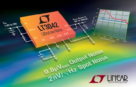 Linear推出領(lǐng)先的超低噪聲、超高電源紋波抑制 (PSRR) 低壓差電壓線性調(diào)節(jié)器 LT3042。該器件獨(dú)特的設(shè)計(jì)具有僅為 2nV/√Hz (在 10kHz) 的超低點(diǎn)噪聲和 0.8µVRMS 的積分輸出噪聲 (在 10Hz 至 100kHz 的寬帶寬內(nèi))。低頻和高頻 PSRR 性能是異常出眾。低頻 PSRR 超過(guò) 90dB (直到 10kHz),而高頻 PSRR 則超過(guò) 75dB (直到 3MHz),可使噪聲或高紋波輸入電源變得 “安靜”。LT3042 運(yùn)用了 LTC 的專(zhuān)有 LDO 架構(gòu),即在一個(gè)高精度電流源基準(zhǔn)之后布設(shè)一個(gè)高性能單位增益緩沖器,從而可產(chǎn)生幾乎恒定的帶寬、噪聲、PSRR 和負(fù)載調(diào)節(jié)性能,這與輸出電壓無(wú)關(guān)。此外,該架構(gòu)還允許把多個(gè) LT3042 并聯(lián)起來(lái)使用,以進(jìn)一步降低噪聲、增加輸出電流和在印刷電路板 (PCB) 上散播熱量。