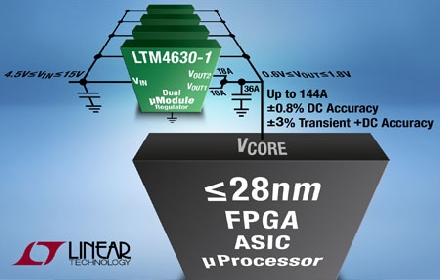 Linear推出雙路 18A 或單路 36A 微型模塊 (µModule®) 穩(wěn)壓器 LTM4630-1,該器件具高精確度輸出電壓調(diào)節(jié),面向 28nm 和低于 28nm 的 FPGA、ASIC 和微處理器。這些先進(jìn)數(shù)字器件的內(nèi)核電壓在穩(wěn)態(tài) (DC) 和快速負(fù)載電流瞬態(tài)時(shí)需要非常準(zhǔn)確的電壓調(diào)節(jié)。LTM4630-1 針對(duì)兩種情況提供了精確的輸出電壓調(diào)節(jié):(a) 在電壓、負(fù)載和溫度 (–40°C 至 125°C) 變化范圍內(nèi)的最大總 DC 誤差為 ±0.8%;(b) 采用最少輸出電容并包括瞬態(tài)在內(nèi)的總誤差為 ±3%。為了給 28nm 和低于 28nm 的中到大功率數(shù)字器件供電,LTM4630-1 可并聯(lián)使用,以均分高達(dá) 144A 的電流 (例如:4 個(gè)器件 x 36A)。LTM4630-1 在 16mm x 16mm x 5.01mm BGA 封裝內(nèi)包括了一個(gè) DC/DC 穩(wěn)壓器、若干電感器和 MOSFET。