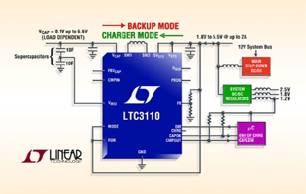 Linear推出雙向、輸入電流可編程的降壓-升壓型超級(jí)電容器充電器 LTC3110,該器件具主動(dòng)充電平衡,適合單或兩節(jié)串聯(lián)超級(jí)電容器。專有的低噪聲降壓-升壓型拓?fù)涫乖撈骷喈?dāng)于兩個(gè)單獨(dú)的開關(guān)穩(wěn)壓器,從而減小了尺寸和成本,并降低了復(fù)雜性。LTC3110 可于備份和充電兩種模式工作。在備份模式,該器件由超級(jí)電容器儲(chǔ)存的能量供電,保持 1.71V 至 5.25V 的系統(tǒng)電壓 (VSYS)。此外,超級(jí)電容器存儲(chǔ)輸入 (VCAP) 具備實(shí)用的寬工作范圍,可從 5.5V 直至 0.1V。這確保實(shí)際儲(chǔ)存的全部超級(jí)電容器能量都能得到利用,因此延長(zhǎng)了備份時(shí)間或減小了存儲(chǔ)電容器尺寸。而在充電模式中,當(dāng)主電源系統(tǒng)有效時(shí),LTC3110 可自主地或通過用戶命令將功率流動(dòng)改為相反方向,利用穩(wěn)定的系統(tǒng)電壓給超級(jí)電容器充電并作出平衡。降壓-升壓型 PWM (脈沖寬度調(diào)制器) 使 VCAP 高效地充電至高于或低于 VSYS。該器件還具備充電模式平均輸入電流限制,能夠以 ±2% 的準(zhǔn)確度設(shè)定至高達(dá) 2A,從而防止系統(tǒng)電源過載,同時(shí)最大限度縮短電容器再充電時(shí)間。