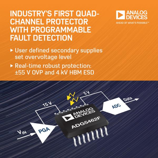 ADI全球領(lǐng)先的高性能信號(hào)處理解決方案供應(yīng)商,最近推出一款四通道保護(hù)器ADG5462F和兩款多路復(fù)用器ADG5248F、ADG5249F,其可提供+/-55-V過(guò)壓保護(hù)(OVP),適用于采用4.5V低壓至36V電壓的精密轉(zhuǎn)換器、放大器和其他器件。四通道保護(hù)器ADG5462F、8:1多路復(fù)用器ADG5248F和差分4:1多路復(fù)用器ADG5249F具有+/-55-V過(guò)壓引腳上電和關(guān)斷級(jí),可針對(duì)熱插拔和操作人員誤用事件提供魯棒的精密保護(hù),從而保障下游模擬器件的安全。利用片內(nèi)故障診斷,新器件成為業(yè)界首個(gè)能夠檢測(cè)并避免缺陷通道的產(chǎn)品,有利于簡(jiǎn)化故障檢測(cè)算法并提升系統(tǒng)正常運(yùn)行時(shí)間。新產(chǎn)品允許用戶(hù)定義與主電源無(wú)關(guān)的故障觸發(fā)電平,最大程度地提高了設(shè)計(jì)靈活性。另外,由于不再需要多個(gè)分立保護(hù)器件,ADG5462F、ADG5248F和ADG5249F使PCB面積得到優(yōu)化,并且設(shè)計(jì)過(guò)程得以簡(jiǎn)化。這些器件針對(duì)精密儀器儀表、過(guò)程控制和航空電子應(yīng)用進(jìn)行了優(yōu)化。