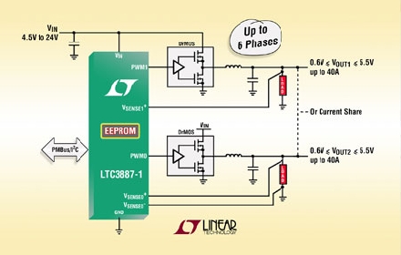 LTC3887-1 調(diào)節(jié)兩個(gè)獨(dú)立的輸出,也可針對(duì)一個(gè) 0.5V 至 5.5V 的兩相單路輸出進(jìn)行配置。最多可交錯(cuò)和并聯(lián) 6 相以在多個(gè) IC 之間實(shí)現(xiàn)準(zhǔn)確的均流,從而最大限度地降低高電流或多輸出應(yīng)用的輸入和輸出濾波要求。一個(gè)集成的放大器提供了真正的遠(yuǎn)端差分輸出電壓檢測(cè),從而可不受電路板 IR 壓降影響以實(shí)現(xiàn)高準(zhǔn)確度調(diào)節(jié)。應(yīng)用包括電信、數(shù)據(jù)通信、計(jì)算和存儲(chǔ)市場(chǎng)所需的大電流 ASIC、FPGA 及處理器電源。