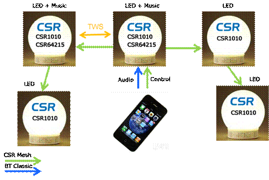 為實(shí)現(xiàn)系統(tǒng)的低功耗和高穩(wěn)定性,大聯(lián)大詮鼎特別選擇了CSR的藍(lán)牙 Mesh和TWS技術(shù)和產(chǎn)品: