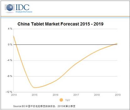 IDC最新發(fā)布的《中國平板電腦市場季度跟蹤報告,2015年第三季度》顯示,2015年第三季度中國平板電腦市場出貨量為621.5 萬臺,同比下降17.8%。IDC 預(yù)計2015年第四季度平板電腦市場出貨量為672.3萬臺,同比下降 9.8%。2015年全年降幅將達10.9%。