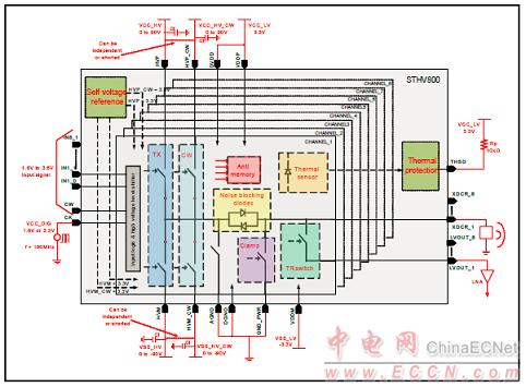 ST公司的STHV800是八路單片高壓高速脈沖發(fā)生器,集成了控制器邏輯接口電路,電平轉(zhuǎn)換器,MOSFET柵極驅(qū)動器,噪音抑制二極管,以及大功率P溝和N溝MOSFET輸出級,峰值電流大于2A,輸出電壓0到 ±90 V,工作頻率高達(dá)20MHz,主要用在醫(yī)用超聲圖像,脈沖波形發(fā)生器,NDT超聲發(fā)送器,壓電傳送設(shè)備.本文介紹了STHV800主要特性和框圖,以及基于STHV800的評估板STEVAL-IME013V1主要特性,硬件框圖,布局圖,兩種超聲波脈沖發(fā)生器解決方案框圖,以及評估板電路圖和材料清單.