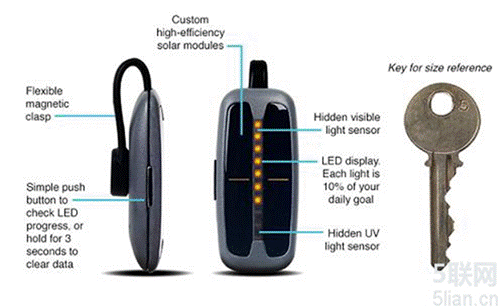 SunSprite僅有鑰匙大小,可以方便地佩戴在領(lǐng)口或是袖口上。機(jī)身配備嵌入式光傳感器,可以準(zhǔn)確測(cè)量出當(dāng)前光照強(qiáng)度,并通過(guò)藍(lán)牙連接到智能手機(jī)和應(yīng)用程序,向用戶反饋每天曬了多少太陽(yáng)、還需要多少陽(yáng)光量等。