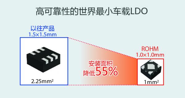 新產(chǎn)品利用ROHM多年來積累的模擬設(shè)計技術(shù)、工藝制造技術(shù)及封裝制造技術(shù)優(yōu)勢開發(fā)而成。產(chǎn)品不僅滿足所要求的特性,作為車載LDO穩(wěn)壓器還實現(xiàn)了世界最小的1mm見方尺寸,與以往的1.5mm見方產(chǎn)品相比,安裝面積可縮減55%。作為車載級產(chǎn)品,不僅確保高可靠性,還支持AEC-Q100標(biāo)準(zhǔn),因此,在汽車等溫度和噪音苛刻的環(huán)境下也可放心使用。