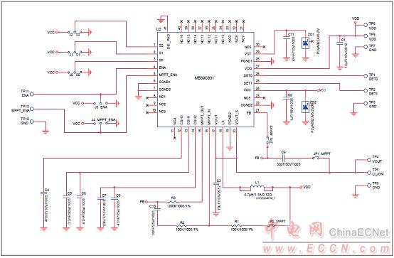 Cypress公司的MB39C831是高效率同步整流升壓DC/DC轉(zhuǎn)換器,包括控制DC/DC轉(zhuǎn)換器輸出跟隨太陽能電池的MPPT和鋰電池安全充電的保護功能,輸入電壓0.3V 到 4.75V,輸出電壓調(diào)整范圍3.0V到5.0V,無負載時的靜態(tài)電流41μA,主要用在太陽能收獲,熱能收獲,手持音頻播放器,手機,電子書,電子詞典,無線遙控控制器和傳感器節(jié)點.本文介紹了MB39C831主要特性,框圖,恒壓模式和充電模式應用電路,以及評估板MB39C831-EVB-03主要指標,框圖,電路圖,材料清單和PCB設計圖.