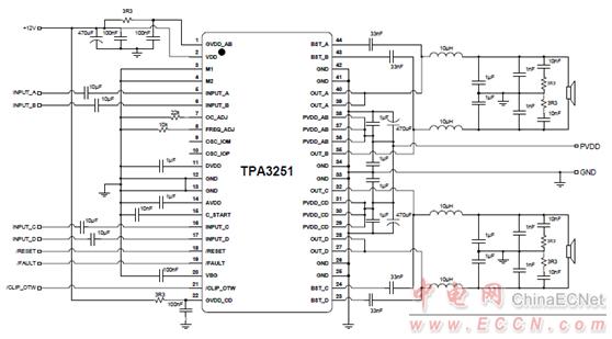 圖3.TPA3251差分輸入BTL應(yīng)用電路圖