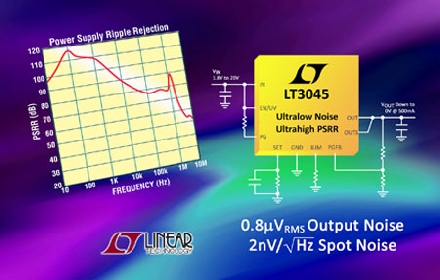Linear推出超低噪聲、超高電源紋波抑制 (PSRR)、低壓差電壓線性穩(wěn)壓器 LT3045,該器件是廣受歡迎的 200mA LT3042 超低噪聲 LDO 的較大輸出電流版本。LT3045 采用獨(dú)特設(shè)計,在 10kHz 時產(chǎn)生僅為 2nV/√Hz 的超低點(diǎn)噪聲,在很寬的 10Hz 至 100kHz  帶寬上產(chǎn)生 0.8µVRMS 整體輸出噪聲。其低頻和高頻 PSRR 性能非常出色。低頻 PSRR 直至 10kHz 時超過 90dB,高頻 PSRR 直至 2.5MHz 時超過 70dB,從而改善了具噪聲或高紋波輸入電源。LT3045 運(yùn)用凌力爾特專有的 LDO 架構(gòu),即精準(zhǔn)電流源基準(zhǔn)之后跟隨一個高性能單位增益緩沖器,從而產(chǎn)生幾乎恒定的帶寬、噪聲、PSRR 和負(fù)載調(diào)節(jié)性能,并不受輸出電壓影響。此外,該架構(gòu)允許多個 LT3045 并聯(lián),以進(jìn)一步降低噪聲、增大輸出電流并在印刷電路板上擴(kuò)散熱量。