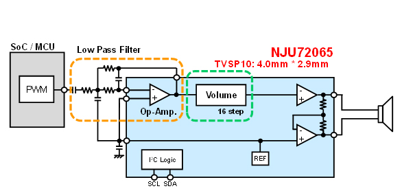 最近,越來越多設(shè)備都裝有音頻輸出。在音頻輸出電路里除了有揚(yáng)聲器放大器之外,更多需求是伴有簡(jiǎn)單的音量調(diào)節(jié)功能。 于是,我們就開發(fā)了帶音量調(diào)節(jié)功能的揚(yáng)聲器放大器NJU72065。它不光能接收模擬音頻信號(hào),也可以靈活應(yīng)對(duì)從MCU發(fā)出的PWM信號(hào)。 因此,系統(tǒng)規(guī)模會(huì)變得更加簡(jiǎn)單,設(shè)計(jì)會(huì)更加容易。 此外,NJU72065采用的是小型封裝,且僅僅配備幾個(gè)外接被動(dòng)元件就可構(gòu)成音頻輸出電路,可有效縮小電路板面積,節(jié)省成本。