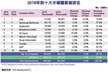 2016年全球前十大半導(dǎo)體業(yè)者排名出爐