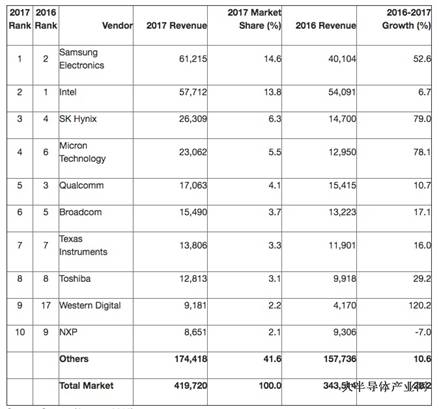 作為最大存儲(chǔ)芯片供應(yīng)商,三星在2017年半導(dǎo)體市場(chǎng)的份額達(dá)到14.6%,首次從英特爾手中奪走第一寶座。自1992年以來(lái),英特爾一直是全球最大芯片制造商。