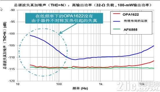如上圖所示,傳統(tǒng)的運(yùn)放由于不對(duì)稱發(fā)熱引起的失真會(huì)體現(xiàn)在這部分低頻時(shí),就會(huì)有很大的THD+N的值。這部分對(duì)于真正愛(ài)好音頻和追求極致音質(zhì)的人來(lái)說(shuō)這是絕對(duì)不能接受的,因?yàn)樗麜?huì)聽(tīng)到諧波一直發(fā)聲。OPA1622特別的設(shè)計(jì)使得兩個(gè)運(yùn)放在內(nèi)部就被設(shè)置好了,當(dāng)發(fā)熱時(shí)這個(gè)影響就會(huì)被消除掉。