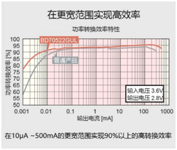 內(nèi)置低損耗MOSFET,負(fù)載模式搭載根據(jù)負(fù)載電流自動(dòng)無(wú)縫切換的Seamless Switching Mode Control (SSMC)功能,在消耗電流1µA以下的DC/DC轉(zhuǎn)換器中,在業(yè)界最寬范圍(10μA~500mA)實(shí)現(xiàn)90%以上的功率轉(zhuǎn)換效率。