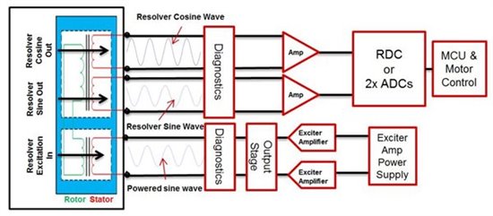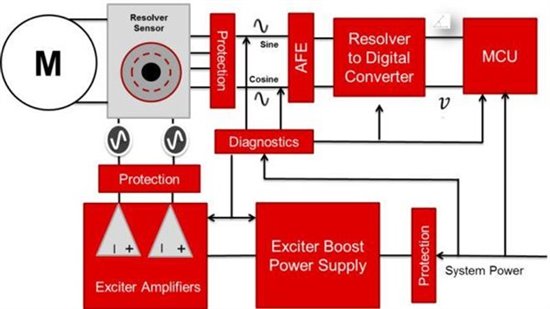 旋變的輸出是模擬信號(hào),需要模擬前端(AFE)對(duì)信號(hào)進(jìn)行濾波、調(diào)整后,反饋給MCU進(jìn)行角度的計(jì)算。旋變數(shù)字轉(zhuǎn)換器(RDC)用來將正弦、余弦模擬信號(hào)轉(zhuǎn)換成數(shù)字信號(hào)。輸出端可以通過多種通信方式將位移、轉(zhuǎn)速信息傳遞給MCU,如SPI、并行接口、仿真編碼器接口、模擬接口等。最后,系統(tǒng)在傳感器和電子元件之間還需要多種保護(hù)和故障檢測(cè)功能,如過流保護(hù)、過壓保護(hù)、短路保護(hù)、過熱保護(hù)等。