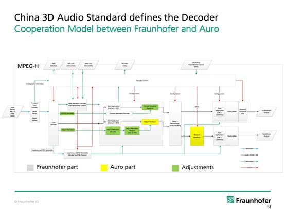 MPEG-H是一組成套的音頻技術(shù),包括編碼、傳輸、解碼,直到終端做聲音還放。即可通過(guò)有線(xiàn)電視也可以通過(guò)互聯(lián)網(wǎng)傳播。下圖是Fraunhofer IIS與捷成世紀(jì)合作模式,為中國(guó)3D音頻標(biāo)準(zhǔn)定義的解碼器。