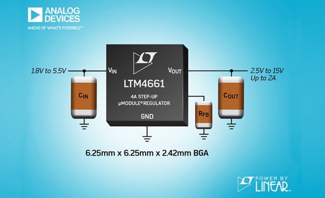 2018 年4月10日Analog Devices (ADI) 宣布推出 Power by Linear™ LTM4661,該器件是一款采用 6.25mm x 6.25mm x 2.42mm BGA 封裝的低功率升壓型 µModule® 穩(wěn)壓器。只需少量的電容器和一個(gè)電阻器即可完成設(shè)計(jì),而且解決方案的占板面積小于 1cm² (單面 PCB) 或 0.5cm² (雙面 PCB)。LTM4661 內(nèi)置了一個(gè)開關(guān) DC/DC 控制器、MOSFET、電感器和支持組件。LTM4661 在 1.8V 至 5.5V 的輸入電源范圍內(nèi)工作,而且在啟動之后可在低至 0.7V 的電壓條件下繼續(xù)運(yùn)行。輸出電壓可利用單個(gè)電阻器設(shè)定在 2.5V 至 15V 的范圍內(nèi)。該器件采用小巧扁薄的封裝并具有寬輸入和輸出電壓范圍,因而成為眾多應(yīng)用的理想選擇,包括光學(xué)模塊、電池供電型設(shè)備、基于電池的備份系統(tǒng)、用于功率放大器或激光二極管的偏置電壓以及小型 DC 電機(jī)。