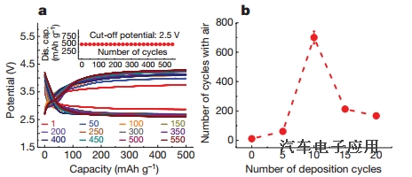 該文作者用MoS2陰極、有該保護(hù)層的鋰陽極,EMIM-BF4/DMSO (25%/75%)混合電解液制成了全電池,并在人工配成的類空氣氣氛中進(jìn)行實(shí)驗(yàn)。第一周的反應(yīng)開始發(fā)生在2.92V,與Li2O2形成的電勢2.96V非常接近,說明了主反應(yīng)進(jìn)行良好,在3.75V時達(dá)到了500mAh/g的比容量。第一周循環(huán)的極化電壓差為0.88V,50周后為1.3V,550周后為1.62V。而在反應(yīng)達(dá)到700周后,電池依然可以工作;與此形成對比的是,不經(jīng)保護(hù)的鋰空氣電池只能循環(huán)10次左右就已經(jīng)失效。對于保護(hù)層的厚度選擇,該文作者認(rèn)為:太薄的保護(hù)層會導(dǎo)致電解液分解,厚的保護(hù)層又會導(dǎo)致大的電荷轉(zhuǎn)移電勢以及副反應(yīng),因此需要優(yōu)化。經(jīng)實(shí)驗(yàn),發(fā)現(xiàn)10次循環(huán)制備的保護(hù)層厚度最為合適。