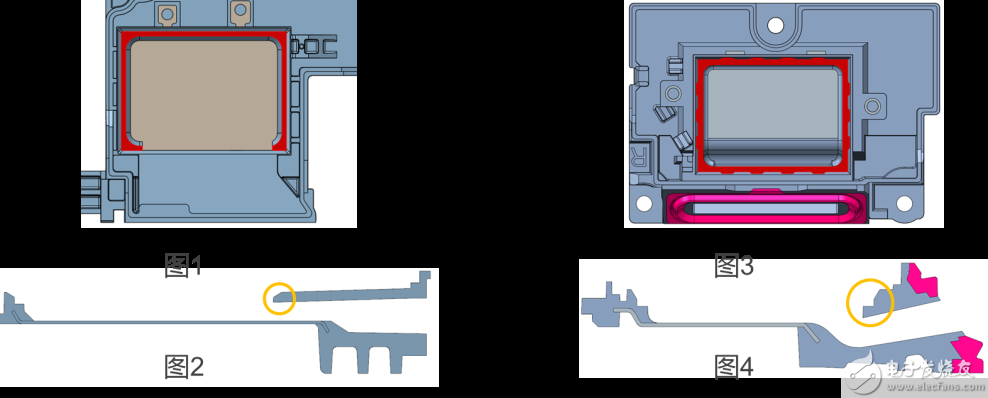 防水BOX需要設(shè)計(jì)四邊臺(tái)階如圖3,普通box設(shè)計(jì)三邊臺(tái)階如圖1,氣壓會(huì)使單體的音膜和盆架分離,造成前后腔串通導(dǎo)致防水失效;截面的差異見圖2和圖4的黃色區(qū)域。