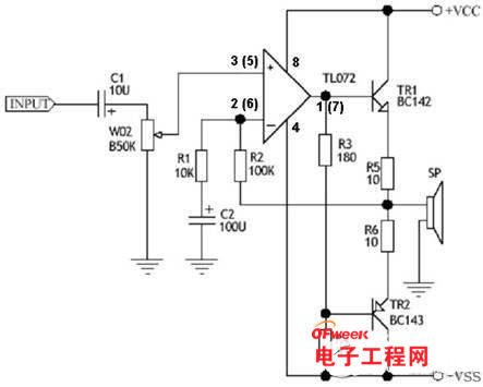 圖中的運(yùn)算放大器IC1於同相輸入放大器,將輸入信號從可變電位器VR1的滑動觸頭連至其同名端(+)。電阻R3和R4有兩個功能:第一功能前面已經(jīng)說過,就是強(qiáng)制運(yùn)算放大器工作在甲類狀態(tài);第二個功能是為TR1和TR2所組成的輸出級提供偏壓。