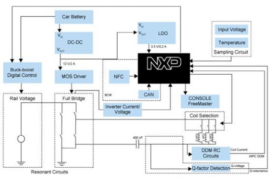 圖示1-應(yīng)用于汽車平臺(tái)的基于NXP產(chǎn)品的無線充電解決方案的系統(tǒng)方案圖